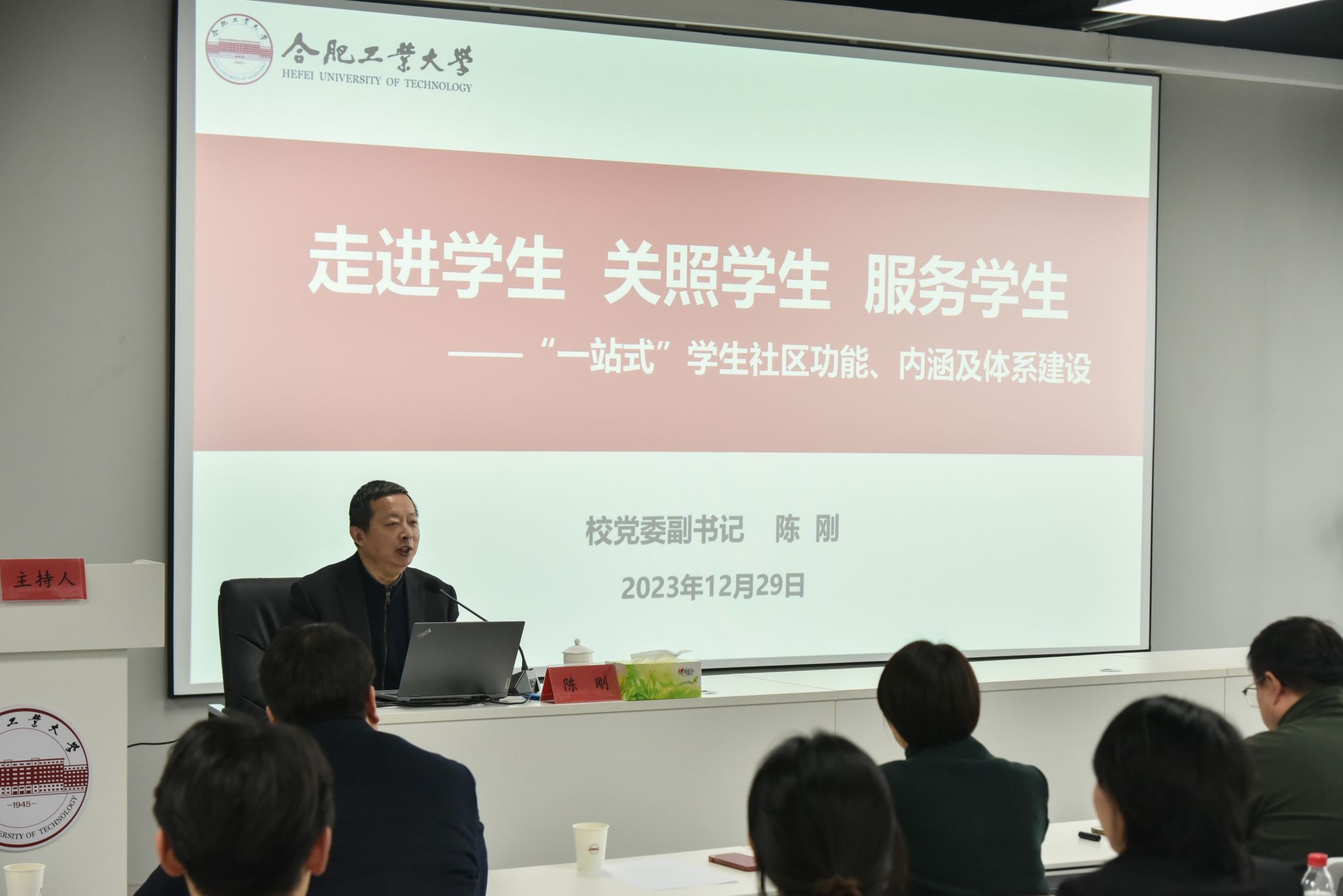 陈刚在报告中围绕我校“一站式”学生社区的建设目标、工作理念、社区氛围、社区平台详细阐述了学生社区建设情况。他在报告中指出,学校始终坚持以学生为中心,顶层谋划,多措并举,在“六个方面”下功夫,确保学生社区运行:一是在协同联动上下功夫,立体多维同频共振,成长教育、业务服务、教育实践、师生队伍,构筑起社区场域多维和育人力量协同;二是在制度保障上下功夫,有效运营常态长效,保障学生社区“门常开、人常在、灯常亮”;三是在价值引领上下功夫,宣教融合铸魂强基,建设“三个阵地”,推进“三向教育”,打造“三味课堂”育人平台;四是在文化浸润上下功夫,氛围营造以文化人,建设各具特色的楼宇和楼层文化,打造最美宿舍,建设“书香社区”,浓郁社区文化氛围;五是在平安创建上下功夫,全时全域稳定校园,以全天候值班、四级网格化管理体系等细致举措推动工作有效开展;六是在智慧赋能上下功夫,贴心驿站一网通办,“智慧学生社区”投入使用,实现“数据多跑路、师生少跑腿”。
