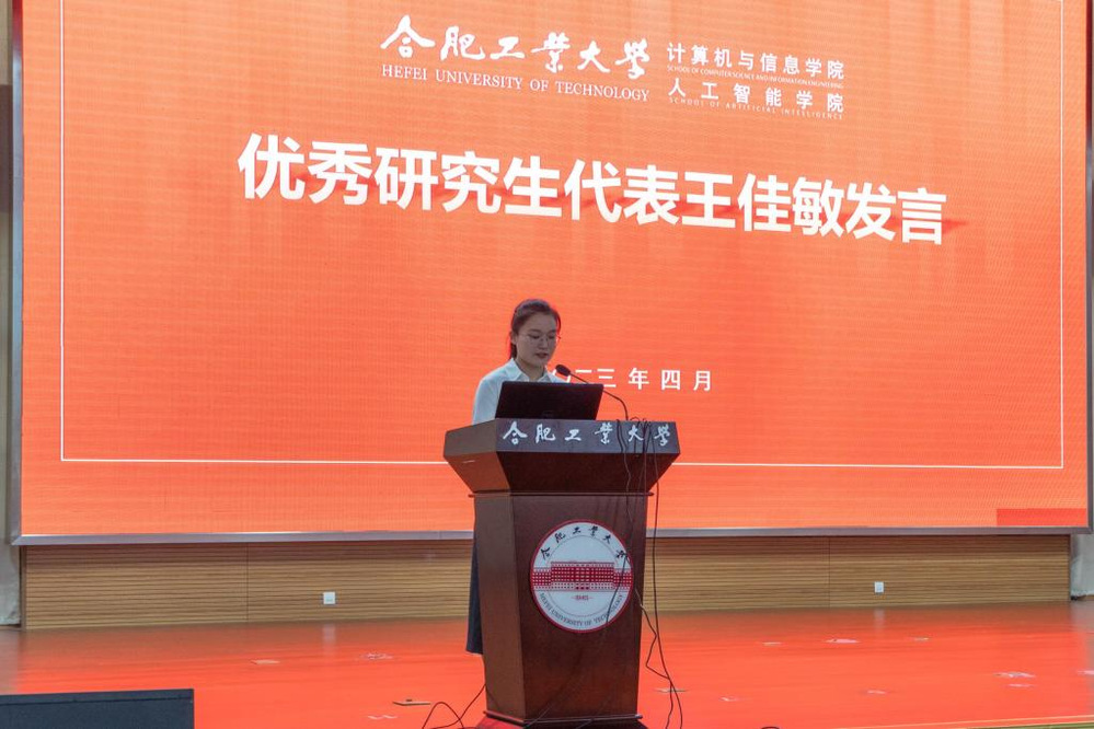 正处级组织员郑荣美宣读了P站视频 2021-2022学年先进个人表彰决定。国家奖学金获得者、安徽省优秀毕业生、计算机科学与技术2020级硕士研究生王佳敏作为学生代表发言,她结合个人经历,号召同学们要以理想照亮前行的路,以奋斗书写青春答卷,以吃苦锤炼过硬本领,以担当彰显初心使命,做“眼中有光”、“脚下有路”、“手上有招”、“肩上有责”的新时代好青年。
