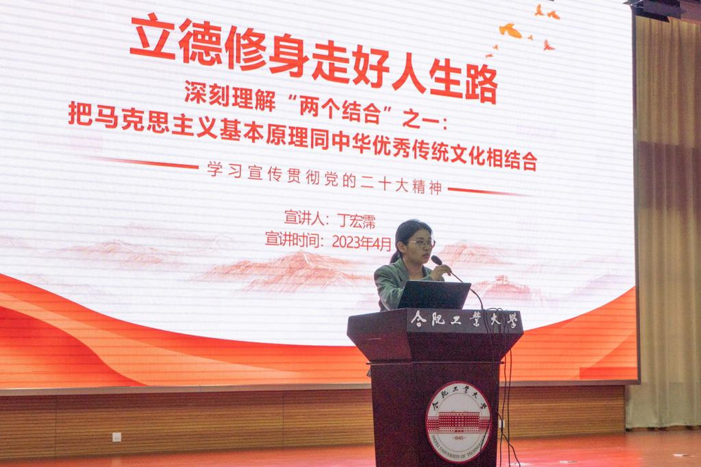 会议最后,学校党的二十大师生宣讲团成员丁宏霈作题为“立德修身走好人生路”的宣讲,围绕科学社会主义价值观,从个人层面、家庭层面、社会层面三个角度,分享如何做好格物致知、诚意正心、修身齐家、治国平天下四个层次,把马克思主义基本原理同中华优秀传统文化相结合,勉励同学们在未来的人生路上传承和弘扬好中华优秀传统文化,为全面建设社会主义现代化强国贡献力量。