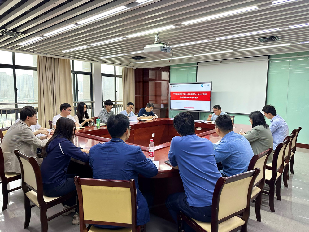 在翡翠科教楼A1106会议室开展“学习贯彻习近平新时代中国特色社会主义思想,培养培育新时代青年教师”专题党课,党课由学院党委书记年永琪主讲,学院近三年新入职的青年教师参会。