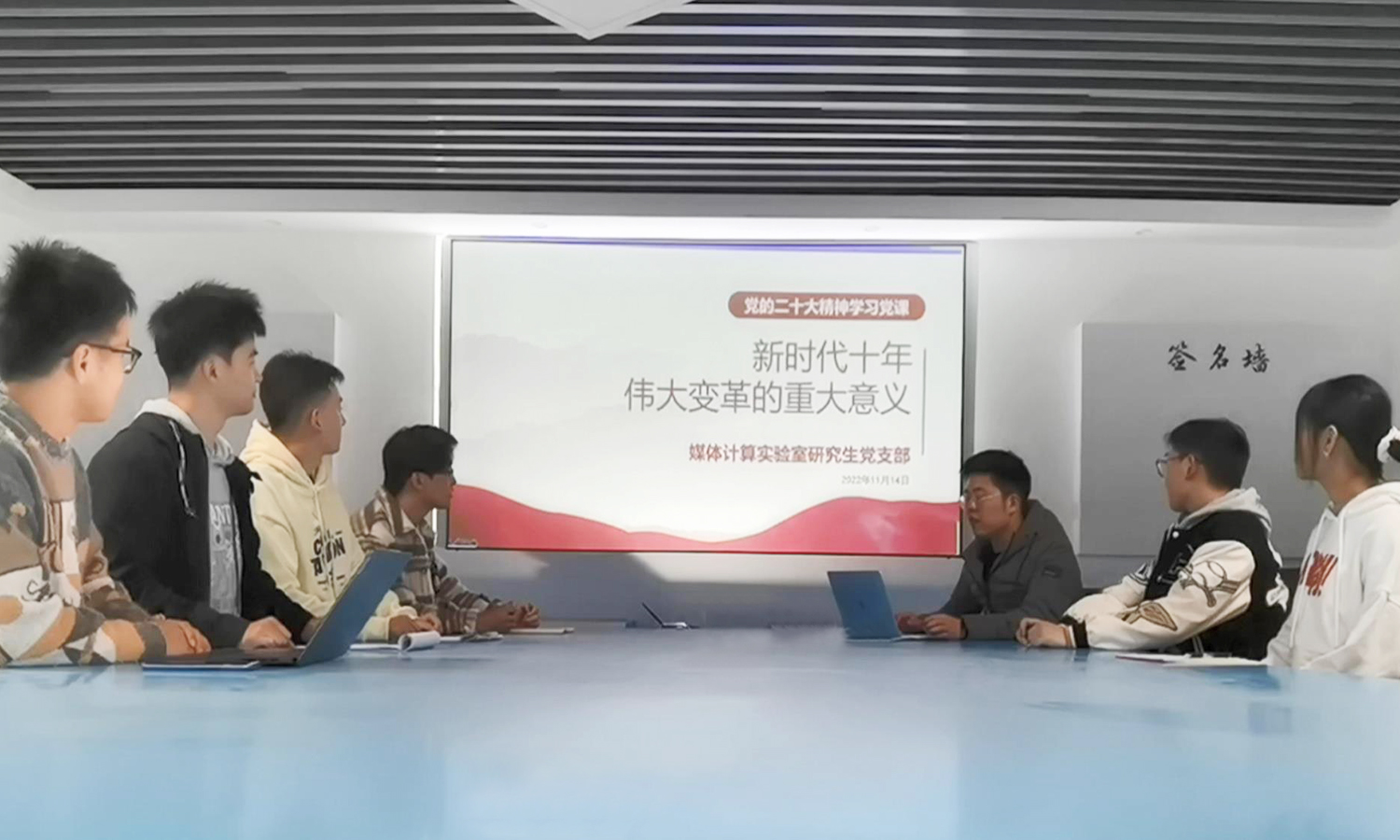媒体计算实验室研究生党支部在科教楼A座9楼中厅开展了“新时代十年的伟大变革”主题党日活动,活动围绕“新时代十年伟大变革的里程碑意义”,深入探讨习近平新时代中国特色社会主义思想,回顾党的光辉历史和十年来我国经济社会的发展变化。支部全体党员参加学习。