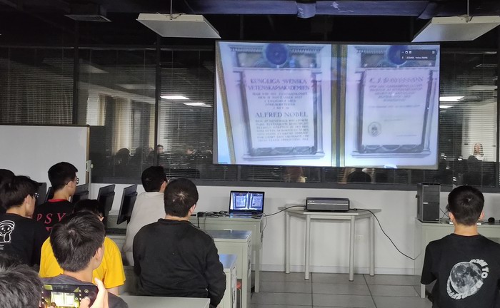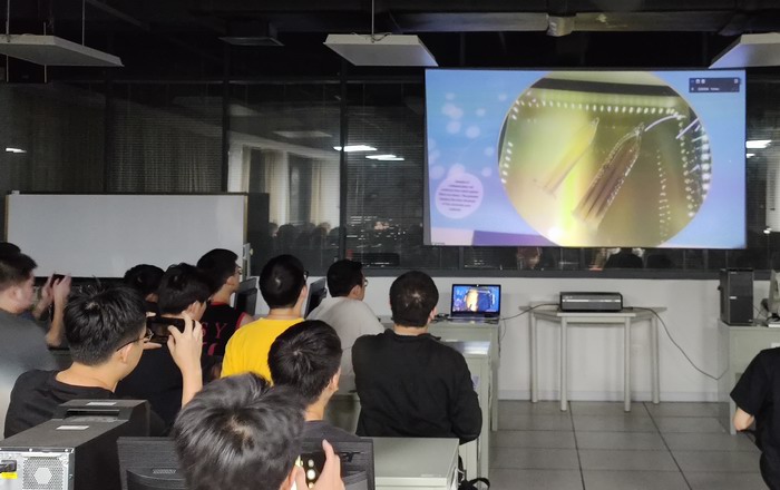 在学校侧,学院五位教师组织同学们在直播大厅,全程观看了介绍。同学们近距离感受了信息与通信技术的发展脉络、杰出成果、贝尔实验室的文化和魅力。在交流互动环节,黄博士就大学生如何投身科研工作,从能力储备方面给出了宝贵的建议。