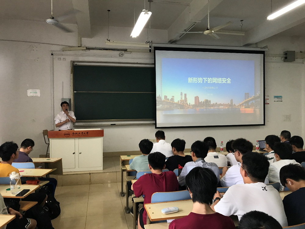 徐士虎先生的报告题目为“新形势下的网络安全”。该报告对国内外网络空间安全发展态势进行了全面分析,并阐述了在电信行业内常见的网络空间安全问题以及相应的解决方案,通过报告学习,同学们对网络空间安全的内涵和业界动态有了更深刻的认识,进一步了解了网络空间安全行业的发展方向。