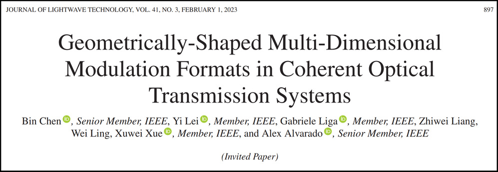 陈斌副教授因近年来在相干光通信新型编码调制领域做出的系统性研究工作,2022年受邀在OFC2022光纤通信大会上做特邀报告(2022年OFC会议大陆高校仅4人受邀做特邀报告),并在OFC会议后继续被邀请在JLT期刊上撰写相关主题的特邀论文(本次中国大陆研究机构作为第一单位仅发表特邀论文3篇)。该论文详细介绍了多维联合调制在高速相干光纤通信中的设计方法和研究现状,尤其是探讨了多维联合调制设计现阶段所面临的实际问题与挑战。同时论文针对现有存在的多维联合调制优化复杂度和光纤传输中非线性噪声串扰问题给出了针对性解决方法,该方法可有效延长9%-25%的长距光通信传输距离。