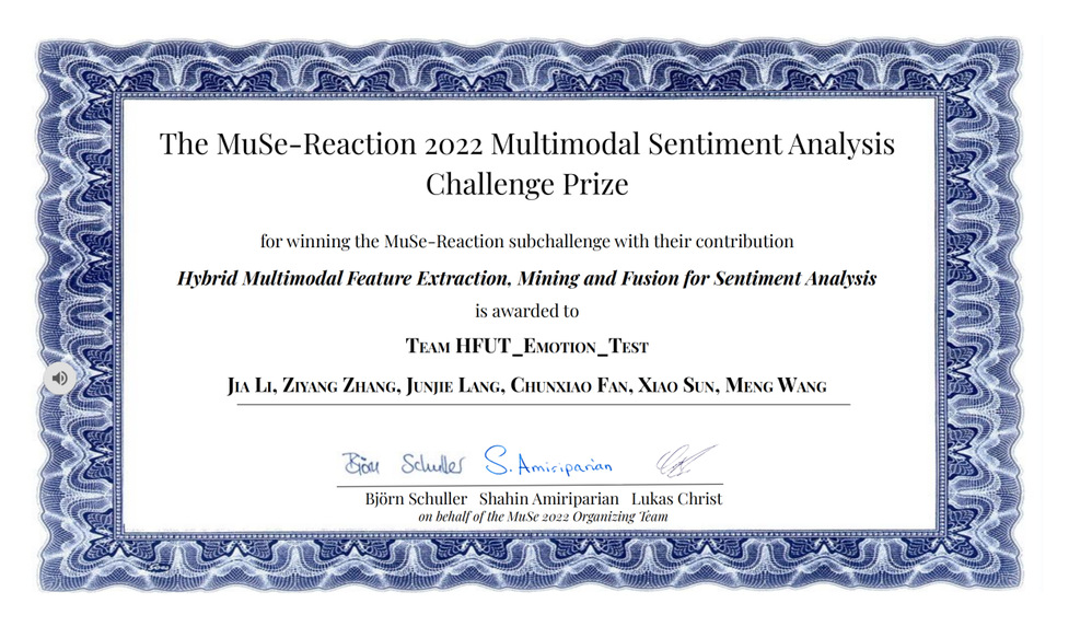 师生首次参加该项赛事,由汪萌教授带队,在孙晓、李佳、樊春晓等几位老师的指导下,由郎俊杰、高升、张梓洋、江月琪等研究生,安鎏玮、邹鹏、徐阳阳、卓泓毅等本科生组成参赛队伍,在情绪反应检测赛道中斩获冠军,针对情绪反应识别问题提出了一种有效的多模态融合解决方案,在复杂情绪反应的检测中取得优异性能,获得第一名;同时,在幽默检测赛道中获得亚军。团队在会议上发表论文,并在线介绍了相关的工作。