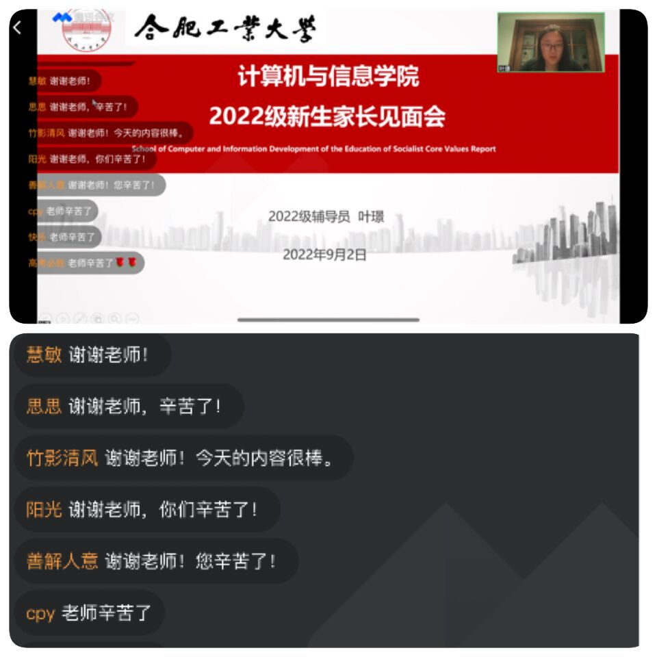 会上,2022级辅导员叶璟从学院的基本情况、学生在校期间成长的重要观测点以及如何更好的家校共育三个方面展开。通过学院的发展历史、学院的师资、学科建设情况等多个内容的讲解促进学生家长更充分的了解孩子就读的学院情况。讲解了大学期间学生成长过程中学业发展、心理健康、综合素养三个重要观测点。通过摘录校纪校规、学籍管理规定中的关键信息结合学生工作案例强调学生进入大学后依然需要家长持续关注学生的学业发展。梳理高校学生心理危机的数据统计情况,介绍常见心理问题的表现,提醒家长一定要重视学生的身心健康。从毕业生的去向分析,大学四年阶段性重点,建议家长鼓励学生们更多元的培养个体的综合素养。最后,与家长分享了几点家校共育的心得。坚持与学校老师积极交流孩子的成长问题。多倾听孩子的烦恼,理解孩子的压力。鼓励孩子在大学期间勇于创新,丰富自己。