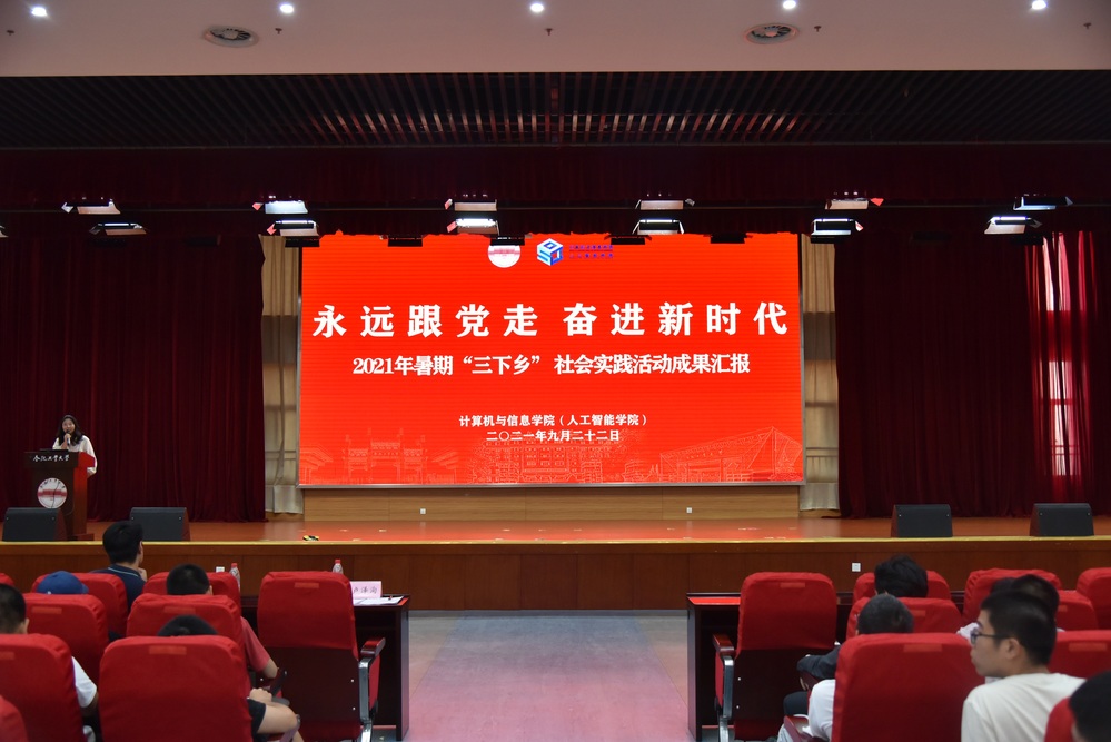 在科教楼二楼报告厅开展“永远跟党走,奋进新时代”2021暑期“三下乡”社会实践活动总结汇报,各支实践团队指导教师、全体2021级本科生参加活动。
