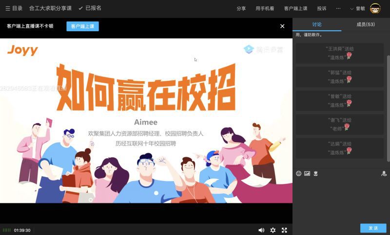 在“如何赢在校招”直播中,YY人力资源部招聘经理温炼炼,主要分享了目前IT行业人才需求的总体情况、主要挑选的条件等,她围绕“做功课”分享了两条途径:一是全方位了解求职公司的信息 ,除了相关网站查询、请教师长前辈等常规操作外,还需要关注公司的“新业务”和“招聘量”等;在“如何制作一份优秀的简历”,博思软件集团招聘经理蔡文辉从一个资深招聘专员的角度进行讲解,建议同学制作有关键字的简历,求职时一定要凸显与应聘岗位相关的关键字,同时建议简历尽量一页完成,为方便同学们理解还结合具体学生的简历进行分析和讲解;在“如何在面试中留下好印象”直播中,前程无忧校园招聘经理王恒帅,讲述了面试过程中的基本环节和基本要求,结合常见面试类型,他给出了相应建议,包括面试中的礼仪礼节等都给出了小技巧,针对同学们的疑惑,还进行互动交流,帮助同学们答疑解惑。