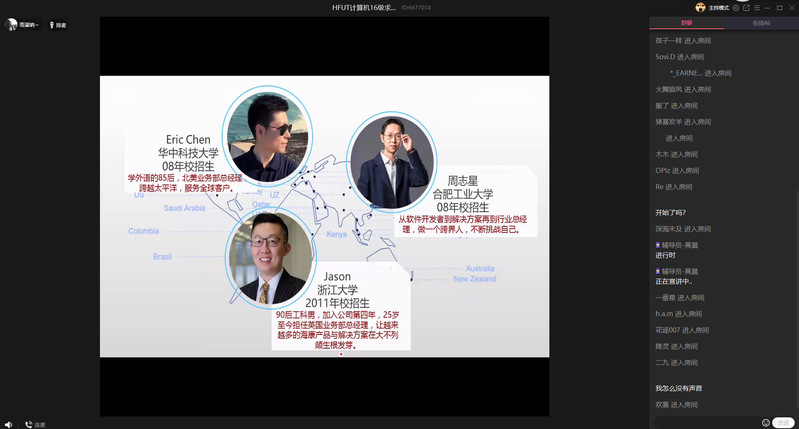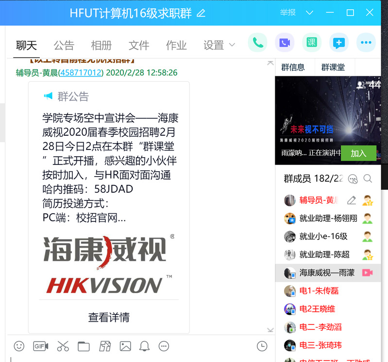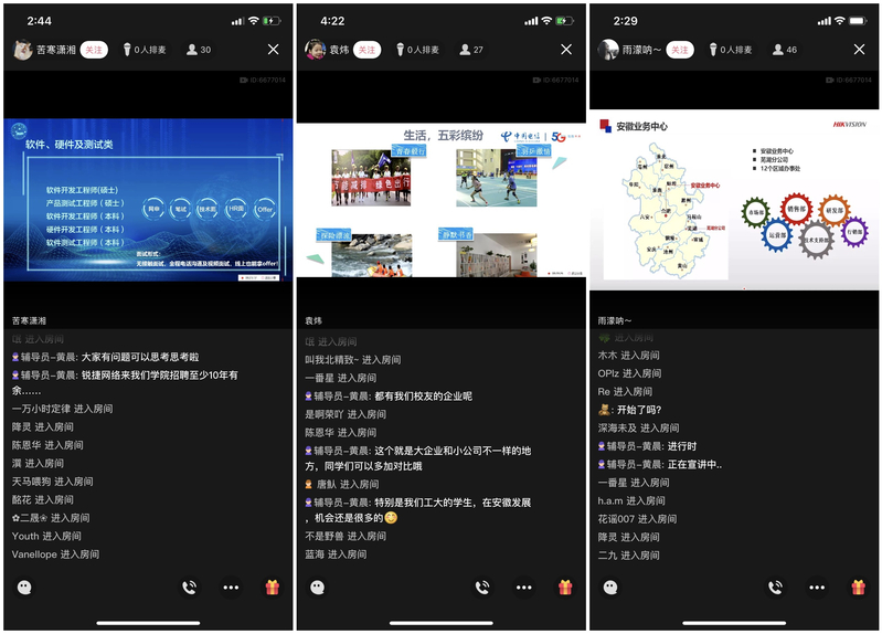海康威视人事专员陈雨濛、锐捷网络HR林远锋和中国电信安徽分公司招聘负责人袁炜在不同时间段分别进行了持续一小时的线上宣讲,通过直播的方式向学院毕业生介绍本企业的发展历程、文化氛围、岗位需求及优秀校友等,分布在各地的计算机学子在直播间和HR互动、沟通。尤其针对自身关心的问题与宣讲人实时互动:“软件开发都是嵌入式方向的吗?”“公司对应届生有系统的培养路径吗?”,气氛十分热烈。