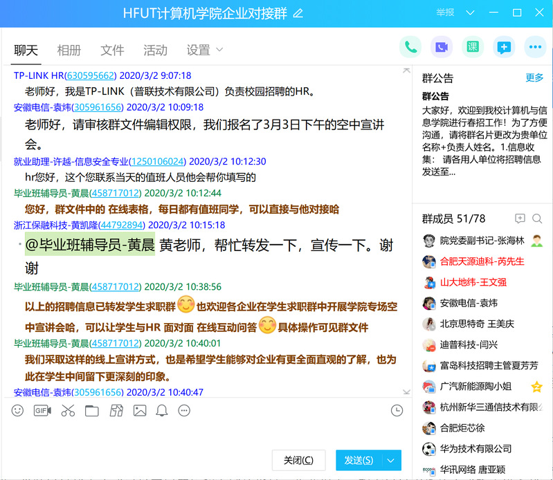致用人单位的一封信》。通过整合测试各类线上直播平台,学院最终建立企业对接QQ群和学生求职QQ群,采用腾讯群课堂的方式进行专场空中宣讲。用人单位可通过企业对接QQ群与当日值班就业志愿者进行预约申请,学院通过“辅导猫”面向未就业学生定点“一对一”发布空中宣讲会报名通知。截止目前企业对接群已邀请68家单位入驻,毕业生求职群239入群,做到未就业学生全覆盖。