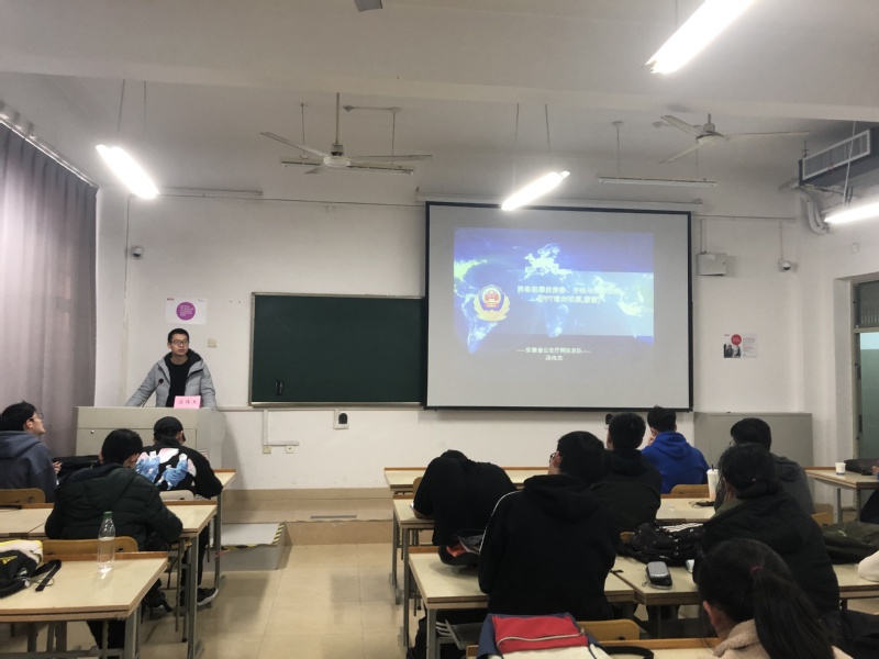 杨波警官从“网络安全法律法规的发展历程”、“网络安全法律法规条款详解”、“网络安全部门执法案例”三个方面作题为“互联网信息服务的相关法律法规”的报告,并向全场学生提出要做知法、懂法、守法的计算机从业者。