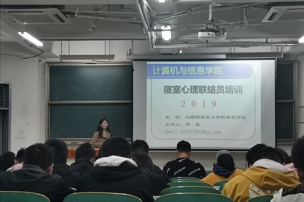 于翠九教201举办2019级寝室心理联络员培训会。2019级各寝室的心理联络员、班级心理委员参与活动。本次培训会讲师为P站视频