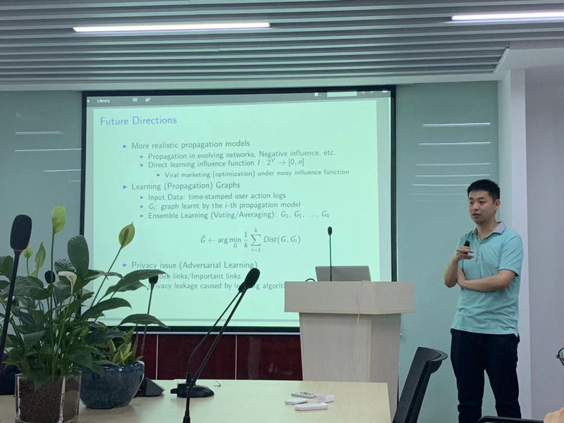 社交影响力最大化旨在给定社交网络中,如何寻找K个最具影响力的用户进行社交营销从而触发最多的社交传播。相关应用研究在广告营销,社交推荐,影响力用户发现等方向有着重要应用前景。在报告会上,杨禹博士系统性介绍了其在社交影响力最大化方向的工作,包括如何针对社交网络时序动态性,进行快速的动态社交影响力最大化运算;如何在离散的折扣优惠下,进行社交影响力最大化问题定义,以及如何考虑影响力用户之类的相关性等。最后,杨禹博士总结了目前该领域的显著成果和应用,并对当前的主要挑战和公开问题进行了讨论。报告会结束后,在座师生就感兴趣的话题和杨禹博士教授进行了深入交流。