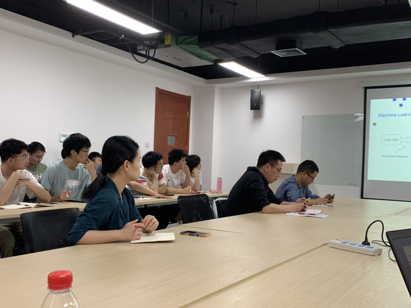 首先陈玲博士介绍了图表征学习(Graph embedding)的问题定义和研究方向。随后,陈玲博士列举了图表征学 习的相关应用场景。图表征哈希(Hashing basedGraph embedding)作为图表征学习的一个重要分支,具有时序效率高的优点,但也存在更大的挑战。针对上述挑战,陈玲博士就她所在课题组在图哈希学习方法上最新的研究成果,提出了两种哈希表示模型,在图的相关任务中,模型能够在不损失精度的情况下获得极大的时间效率提升。同时,陈玲博士也针对近期新的研究方向如:Mate-learning和AutoML,提出了自己的看法。报告会结束后,在座师生就感兴趣的话题和陈玲博士进行了深入交流。