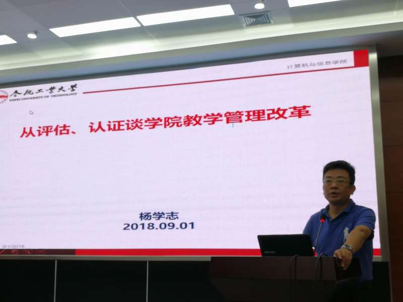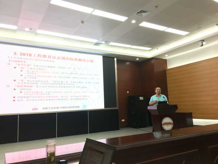 上午,胡学钢教授宣布研讨会开始,随后汪萌院长代表学院致辞,并就后续学院专业建设与发展提出了自己的意见和想法供大家讨论;之后,许明扬主任畅谈了自己对计算机工程教育认证和质量建设方面的见解;杨学志副院长针对当前学院审核性评估工作介绍了当前学院的教学管理工作并谈了后续要开展的一些改革;胡学钢教授重点解读了2018工程教育认证的新标准,着重介绍了需要关注的一些细节;王浩教授给参会人员做了“复杂工程问题及其在教学中的体现”的报告,帮助大家理解专业培养目标与课程之间的关系以及专业认证中的一些问题;安鑫主任介绍了上一轮计算机专业工程教育认证自评报告组织方面的问题和反思,并介绍了下一步工作计划;齐美彬教授随后介绍了电子信息工程专业工程认证方面的总结和反思,并对相关问题做了分析和梳理,同时给出了后续的工作计划和建议;之后,王浩教授和吴共庆副教授对审核评估教学材料的抽查结果进行了通报和分析;上午的研讨会在胡学钢教授组织的工程认证相关机制和建设工作的深入讨论中结束。