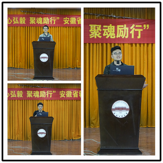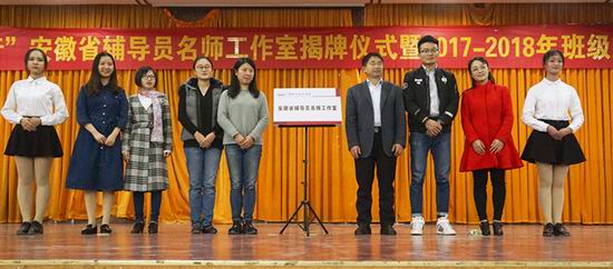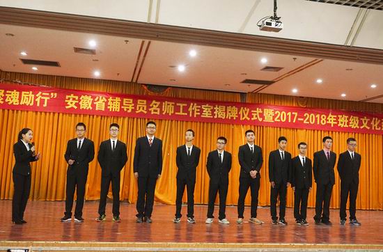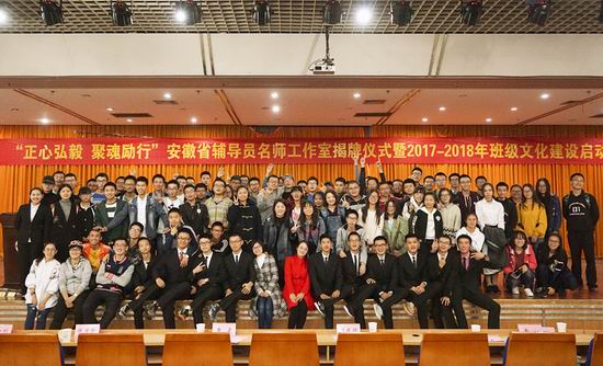 在翡翠湖校区图书馆报告厅举行“正心弘毅,聚魂励行”安徽省辅导员名师工作室揭牌仪式暨班级文化建设启动仪式。学院党委副书记、副院长何庆领老师,学院团委书记黄晨老师,学院各个年级辅导员老师们以及2017级425余名同学参与了此次启动仪式。