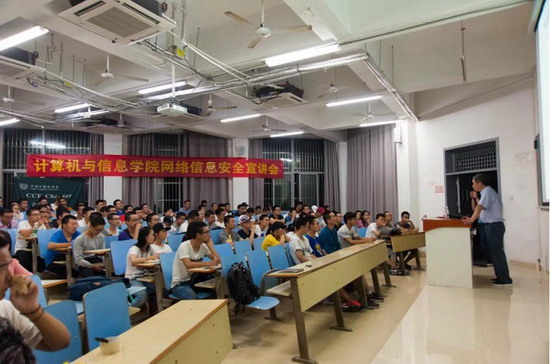 网络安全研究所教授进行相关宣讲。学院网络与信息安全研究所的侯整风教授为同学们进行了一场关于网络安全和网络威胁等相关知识的宣讲。宣讲会上,侯教授着重从网络安全威胁与网络安全技术两大方面进行了讲解。教授利用互联网的发展史入手举出详细的例子,向学生讲述包括截获、篡改、伪造等12种网络安全威胁的运作原理、表现形式与可能危害。同时又对包括数据加密、信息隐藏、防火墙等11种保护信息的网络安全技术进行了相关概述。