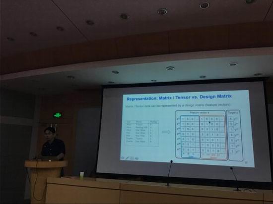 会上何博士主要讲解Factorization Machines(简称 FM)算法,FM算法可对任意的实值向量进行预测。其主要优点包括: 1) 可用于高度稀疏数据场景;2) 具有线性的计算复杂度。何博士以推荐系统为例引入FM,讲了什么是线性回归和多项式回归;介绍了利用FM可以进行各种预测任务,如回归、分类和排名;通过FM模型可以推广到MF、SVD++等模型;总结了FM的优点和缺点。最后何博士提及了他最新的工作是“Neural Factorization Machines”,主要是利用DNNs实现FM。
