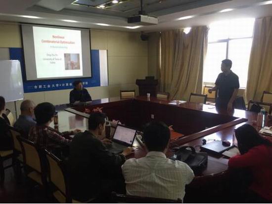 李廉老师和安宁老师的邀请,2017年4月23日,德克萨斯大学达拉斯分校(UTD)计算机系堵丁柱教授到我校逸夫楼408会议室,做了关于“Nonlinear Combinatorial Optimization in Social Computing非线性组合优化与社会计算”的学术报告。报告由吴共庆老师主持,老人福祉科技实验室和计算机学院相关师生参加了本次报告。