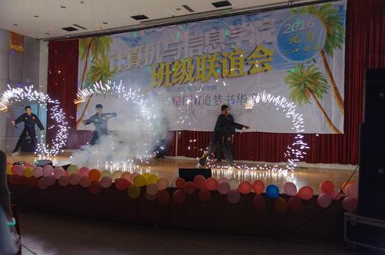 灯光一暗,晚会的开场节目正式上演。四位双截棍社的社员身着道服,把双截棍耍得虎虎生风。更精彩的还在后面,随着灯光熄灭,双截棍上闪出绚丽的焰火,双截棍的舞动越趋华丽,一曲落罢,焰火停歇,同学们的热情已被彻底激起!之后四位主持人随着灯光的亮起一齐上台,精彩的开场白赢得现场掌声,之后的节目更是高潮迭起。歌舞剧《小丑漫游动物异世界》中小丑的精彩表演赢得全场喝彩。节目《爱》、《苹果杯子舞》歌舞双飞。吉他弹唱《谁的心在飞》更是让人惊叹我P站视频