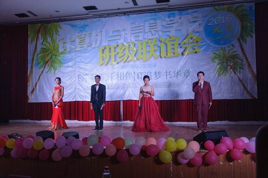 班级联谊会在翡翠湖校区综合楼301正式开幕。晚会以“E路起航乐相伴,IT追梦书华章。”为主题,学院团委书记黄晨、2014级辅导员叶璟、2015级辅导员陈曾珍、2016级辅导员杜欣鹏亲临现场观看。