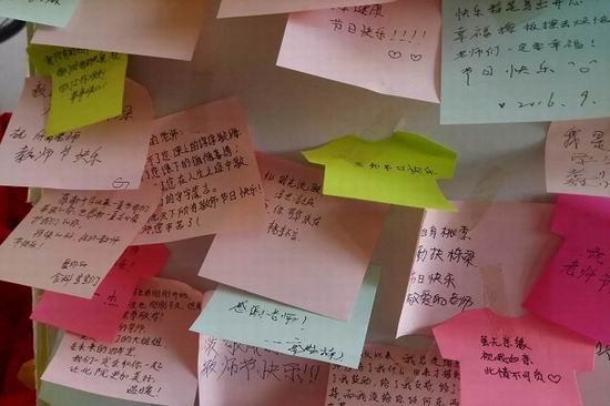 本次教师节系列活动分为线上和线下两部分。9月10日中午翡翠湖校区三食堂广场举办了“微微一言很暖心”教师节寄语活动。同学们积极响应号召,即使炎炎烈日也阻挡不了同学们热情,纷纷驻足,通过亲笔文字向恩师传递他们最真诚的祝福。
