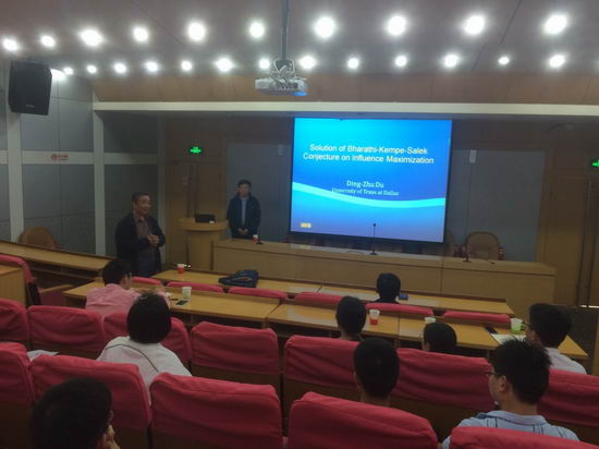 首先由堵丁柱教授给大家带来题为Solution of Bharathi-Kempe-Salek Conjecture on Influence Maximization的报告。堵教授详细介绍了影响最大化是社交网络研究中的一个重要问题。并介绍了社交网络中的IC模型和LT模型。
