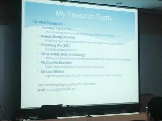 徐敏博士跟我们分享了她近期关于多媒体情感分析的相关研究成果,此工作最近刚被IEEE Transactions Neural Networks and Learning Systems接受,在报告中详细的介绍了当前多媒体情感分析的研究进展以及网络多媒体大数据分类和检索等内容。她最早提出利用多模态的不同特征以及相互作用,尤其是利用音频关键字来辅助视频分析,从而检测体育视频中的重要事件。她还提出从底层特征,先生成一组中层语义表达,并利用中层语义表达进一步推断高层语义。并且在发表在 ACM Multimedia上的一篇文章中提出了一种分层分析情感强度和类别的方法,并利用多模态特征特融合实现在Arousal-Valence空间中的情感识别。最后,老师和同学们积极提问,徐敏博士耐心、详细的解答了问题,与会老师及同学获益匪浅。