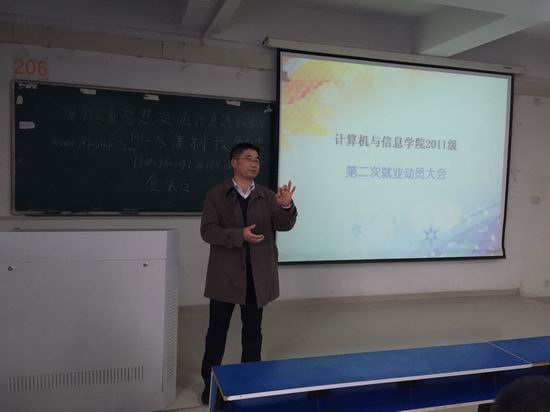 2015届毕业生第二次就业动员大会于3月27日下午3点在西二教学楼206召开。学院党委副书记、副院长何庆领,2011级辅导员叶璟和2011级本科生参加了动员大会。