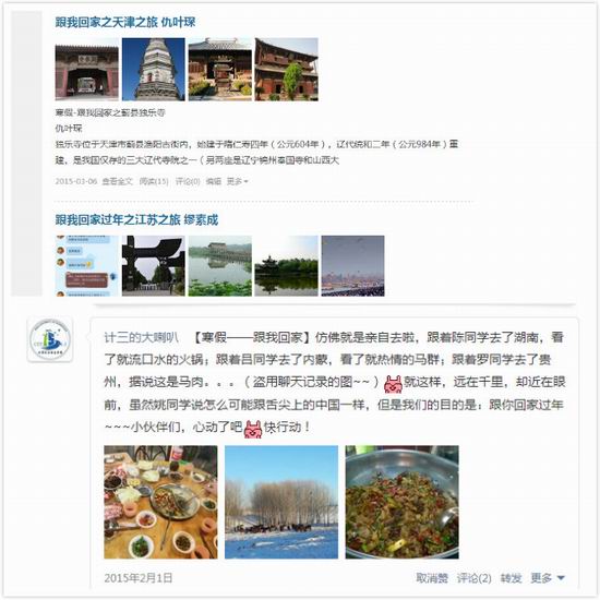 计算机14-3班开展了以“踏遍山河中华情之寒假跟我回家过年”主题团日活动,利用QQ空间网络平台,实时分享各自家乡的壮美景色,感受祖国地域文化和人文情怀的博大精深;以计算机科学与技术14-1班周楠同学为代表的“高中校友”们,则是回到了他们的母校,为学弟学妹们分享大学的点滴;通信工程14-2班的戚航同学也是积极志愿参与社区爱心送春联活动,以实际行动践行核心价值观。