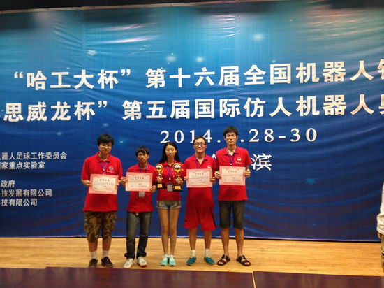 HfutEngine代表队在王浩教授、方宝富副教授的指导下参加了仿人机器人单人舞蹈、双人舞蹈、短跑、障碍跑、点球及机器人捡垃圾6个比赛项目,最后获得捡垃圾比赛亚军(一等奖)、双人舞蹈季军(一等奖)、障碍跑一等奖及3项二等奖,成绩非常优异。
