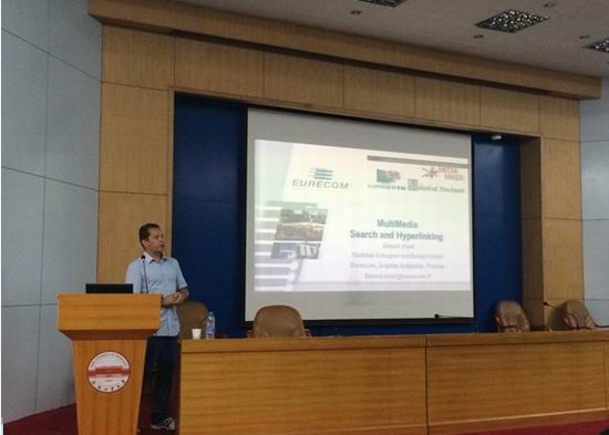 报告会上,Huet教授首先介绍了其研究团队在研的一些项目,并从如何对海量多媒体进行有效的管理这一问题出发,探讨了多媒体检索和多媒体超链接两种具体的解决思路。其中,多媒体检索是一种目前研究中常用的多媒体管理方法,而多媒体超链接则是通过若干种子文档,建立多媒体文档联系的一种技术。报告中, Huet教授详细介绍了其研究团队参加MediaEval国际比赛中多媒体检索和超链接的相关工作,他们通过对文本和视觉特征进行融合的方法,在该比赛的这两大任务中得到了较好的成绩。
