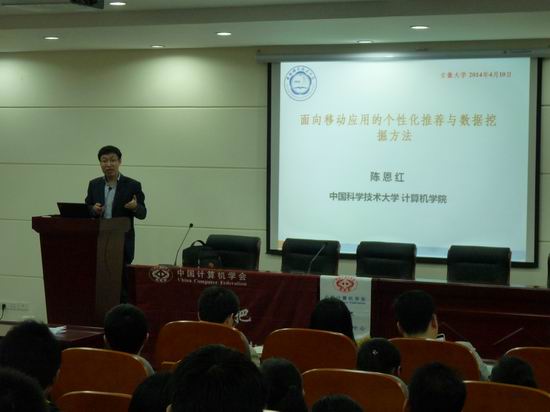 陈恩红教授通过生活中的实例向大家介绍了大数据的产生、特点及广泛的应用领域,并就“个性化推荐”的相关数据挖掘的方法向广大师生进行了细致入微的介绍。整场报告会掌声不断,陈恩红教授深入浅出的讲解也让在场师生领略到了科技的无穷魅力。最后,部分师生就自己感兴趣的问题与陈恩红教授进行了深入的交流和探讨。