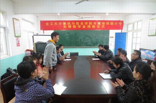 2012级国家奖学金获得者王晨光同学与学院第二届义卖节活动盈利额,用于奖励梁墩回族小学各年级优秀的家庭贫困学生,捐助仪式上,梁墩回族小学校长石立银对P站视频