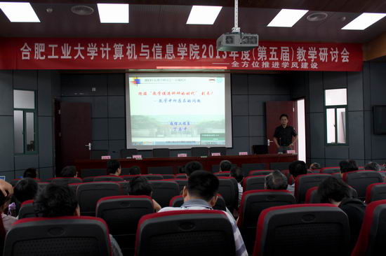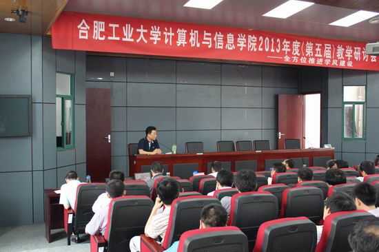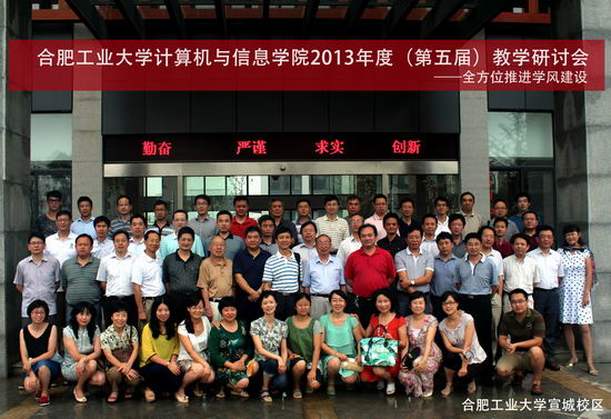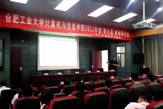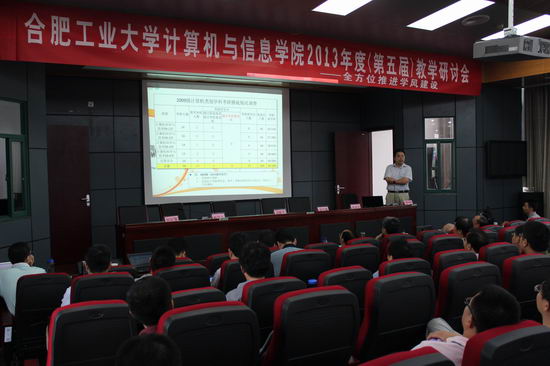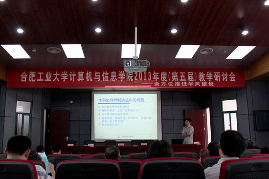 在我校宣城校区召开了2013年度(第五届)教学研讨会,会议主题为“全方位推进学风建设”。本科教学专场主要围绕“加强课程组建设-迎接宣城校区的教学任务”、“提升毕业设计质量管理-培养合格大学生”、“落实本科生导师制-提高培养质量”三个方面展开;研究生教学专场主要围绕“研究生课程设置修订”、“研究生培养相关规则的修订”、“提高研究生招生及培养质量的措施”、“计算机科学与技术专业自主命题”展开。副校长刘晓平、宣城校区管委会副主任胡学钢、原副校长韩江洪、院党委书记蒋建国、副书记何庆领、副院长杨学志、副院长郑利平、院长助理王伟、各系所、中心负责人、责任教授、学院教学督导组成员、教师代表、教学行政办公室人员共60余人参加了本次会议。