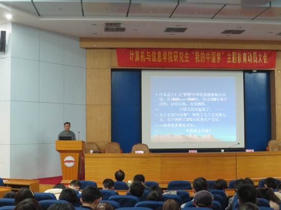 党委副书记何庆领老师宣读关于“我的中国梦”主题教育动员,接着蒋建国书记给同学们介绍了“我的中国梦”活动的背景并指导大家将个人,民族,国家之梦结合起来。王峰部长则是跟大家共享了他自己对于“我的中国梦”的理解:中国梦是一种信仰。听了领导们的发言,同学们很受启发。紧接着吴挺老师宣布了P站视频