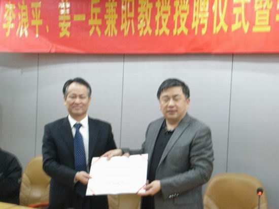 2013年3月19日下午,李浪平兼职教授聘仪式在校学术会议中心第二会议室举行, 吴玉程副校长出席仪式并颁发聘书。