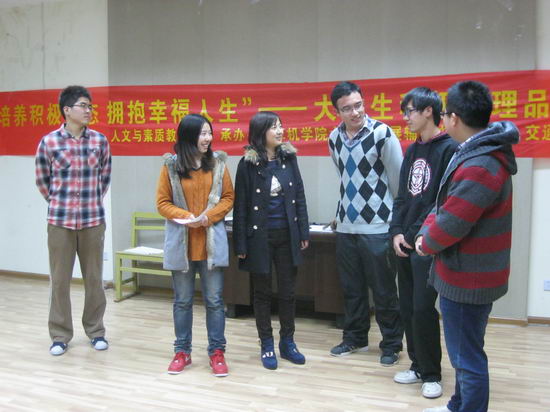 开展大学生心理健康普及性教育特色活动之一,是我校推广积极心理学应用模式的新探索。它旨在通过 “培养积极心态、拥抱幸福人生”为主题的心理健康教育活动,充分挖掘大学生固有潜在的具有建设性的力量,引导学生全面客观认识自我,发掘自我潜能,有效促进团体成员积极品质的培养。