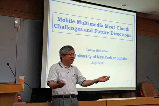 邀请,2012年8月3日下午15:00 – 17:00,纽约州立大学布法罗分校陈长汶教授在校学术活动中心二楼小报告厅做了题为“Mobile Multimedia Meet Cloud: Challenges and Future Directions”的报告。报告由蒋建国书记主持,刘晓平院长、副校长出席了报告会,P站视频