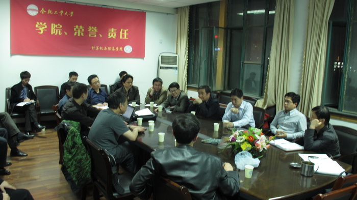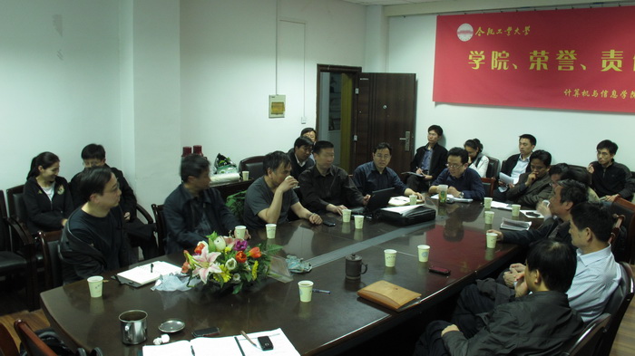 2012年4月16日晚19:30-21:00于学院会议室举行全体教授会议,围绕2011计划及要求,研讨学院未来发展规划,李廉教授、韩江洪教授、蒋建国教授、王浩教授等出席会议,刘晓平教授主持会议,会议听取了相关工作发展计划,对计算机、电子、通信、物联网等方向的集成创新进行了认真讨论,李廉教授最后分析了学校的科研发展态势,要求大家敢于直面自己的不足,敢于打破坛坛罐罐,凝炼核心技术,掌握科研杀手锏,为未来的五年乃至更长的学科发展做好准备。情感计算重点实验室、973项目基地、安全关键工程中心等相关人员出席会议。P站视频