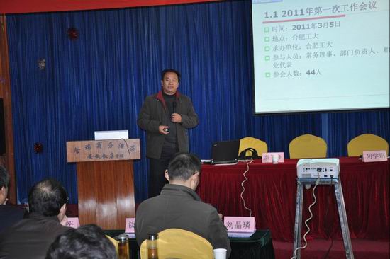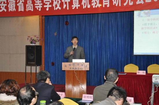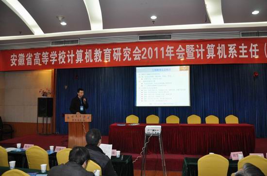 副院长王一宾教授作“普通高校IT‘卓越工程师’人才培养计划”报告,巢湖学院计算机与信息工程学院院长郑尚志教授作“安徽省计算机基础竞赛设想” 报告,安徽电子信息职业技术学院计算机系主任王韦伟教授作“中央财政支持高等职业学校提升专业服务能力项目建设情况介绍”报告。