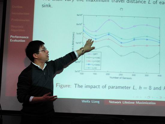 报告关注于延长基于多移动基站的传感器网络的生存时间。使用的算法是构建基站的移动路径,并使得采集到的数据通过多跳的方式到达基站。梁教授首先对这个问题进行了形式化描述,并指出找出满足条件的路径一个NP完全问题。然后利用网络流已有的技术设计出全新的启发式算法。最终通过数个模拟实验对所提出的算法在网络生存时间上进行了评估。实验结果证明所提出的启发式算法的最佳性能可以达到最优值的93%。