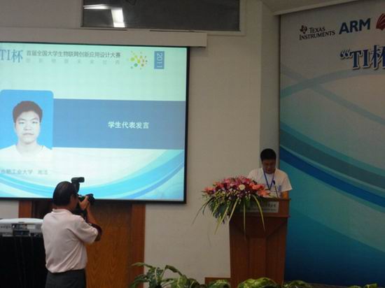 25日下午,决赛颁奖典礼在北京师范大学英东楼演讲厅隆重举行。北京师范大学党委副书记王炳林教授、中国电子学会副秘书长刘明亮先生、中国科学院院士姚建铨教授、德州仪器(TI)公司亚洲区大学计划总监沈洁女士、ARM公司高级经理冯成先生,以及全体参赛选手、领队老师出席了颁奖典礼。我校周浩同学代表全体参赛队员作大会发言。