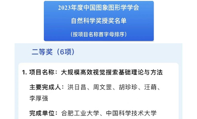 洪日昌教授、胡珍珍副教授、汪萌教授及中国科学技术大学的周文罡教授、李厚强教授共同完成的“大规模高效视觉搜索基础理论与方法”荣获中国图象图形学学会自然科学奖二等奖。