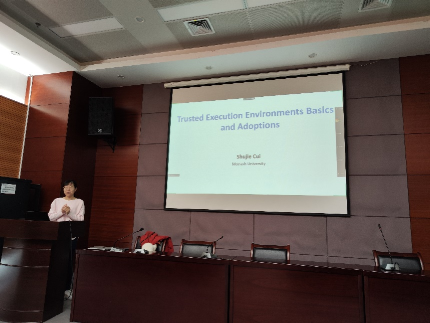 师生做了题为“Trusted Execution Environments Basics and Adoptions”的学术报告。李萌老师主持了本次报告会,学院安全方向的老师和学生参加了报告会。