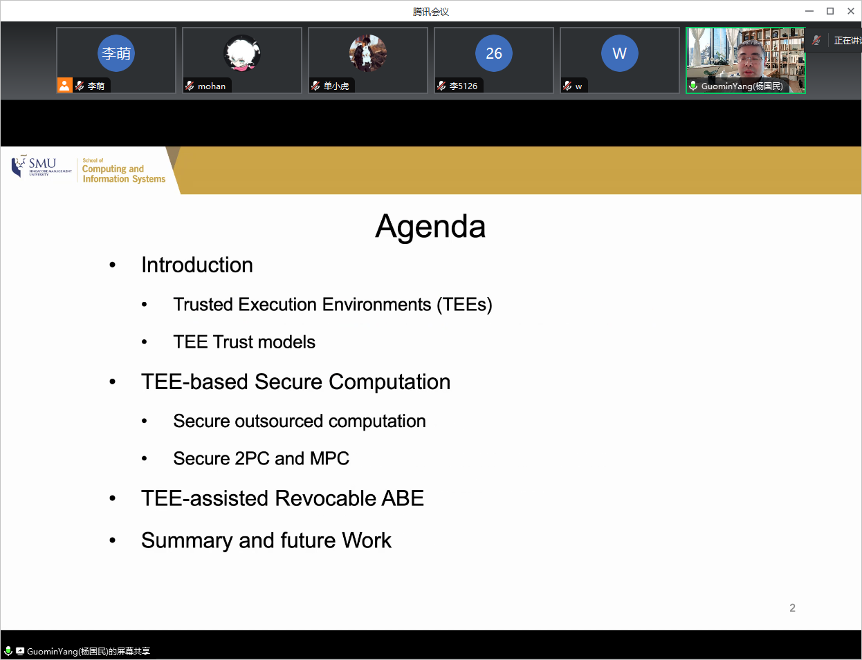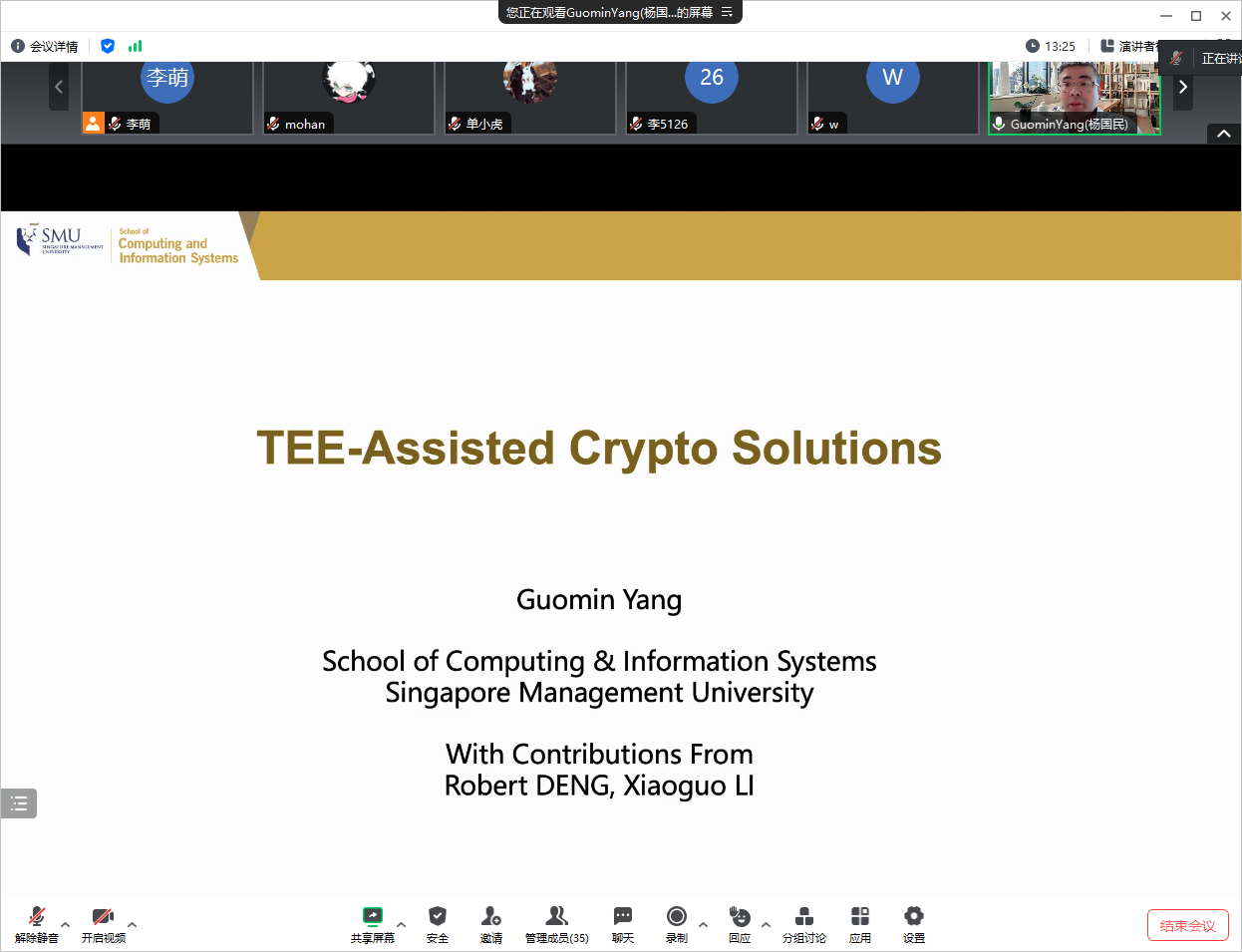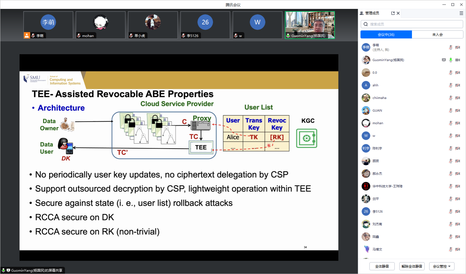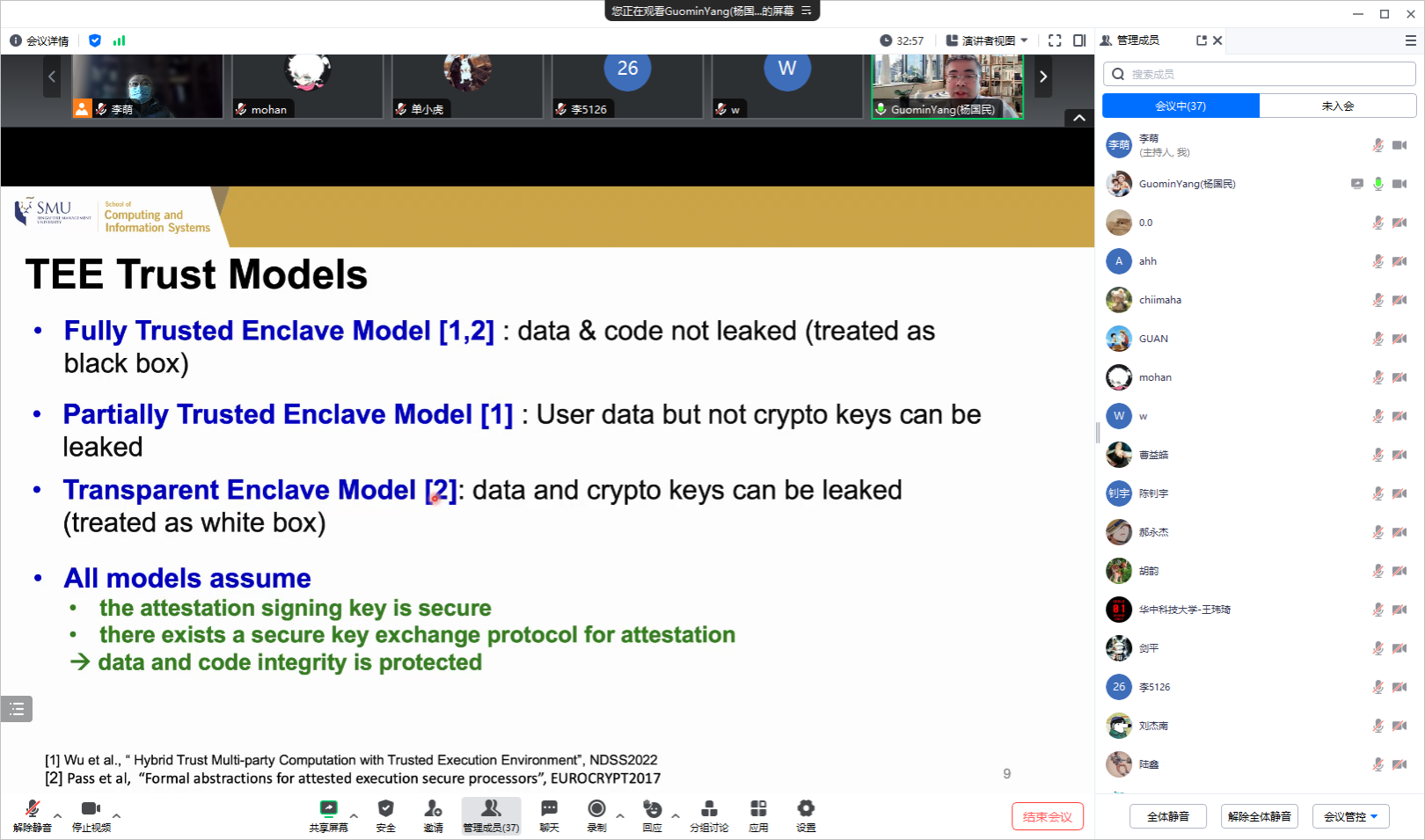 在报告会上,Yang老师介绍了TEE技术以及基于TEE的安全计算。在报告结束后,李萌老师和研究生向Yang老师请教了TEE数据流框架、如何验证TEE程序和去SMU读博等问题。