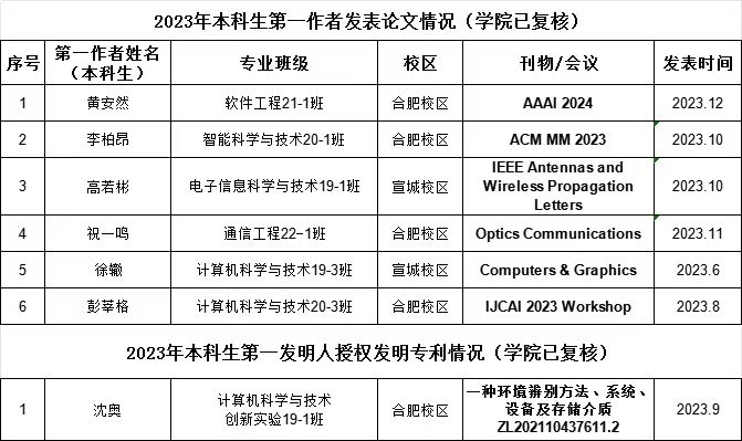 本科生以第一作者发表高水平论文6篇;本科生以第一发明人申报发明专利10项(已授权1项),具体清单如下。