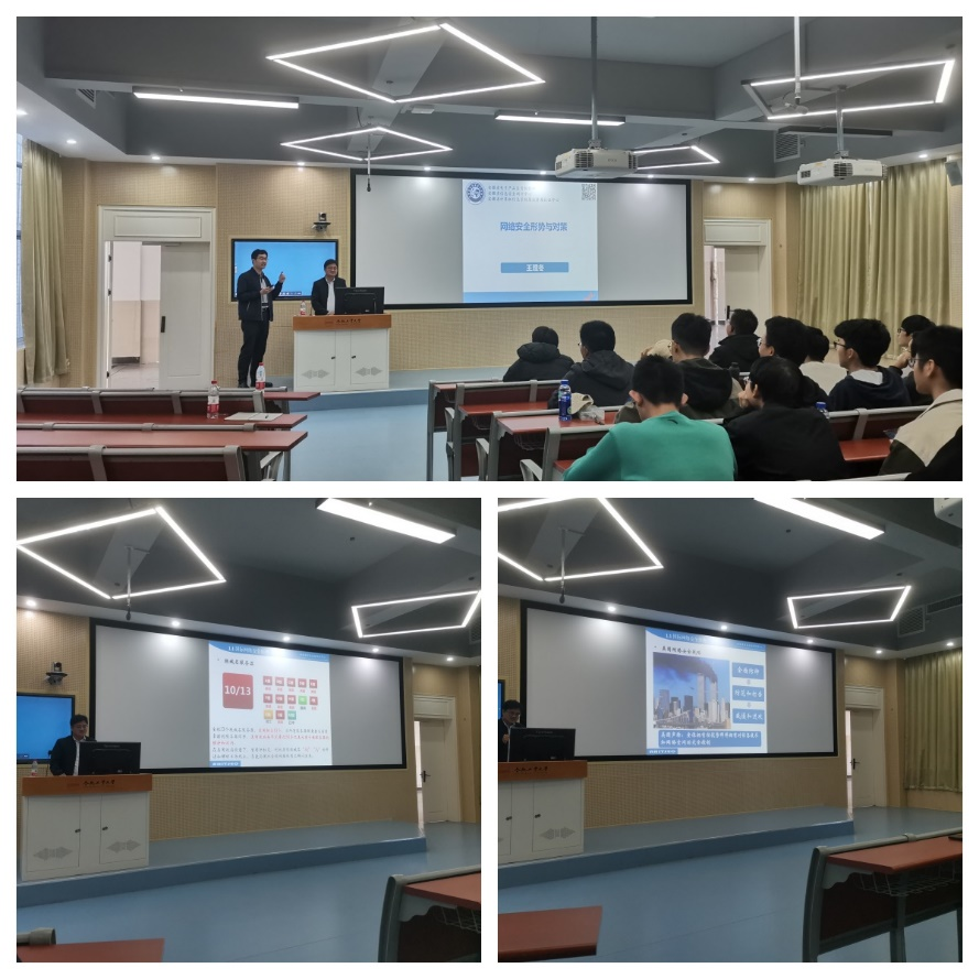 此次授课以“网络安全形势与对策”为题,结合网络安全经典案例,王理冬高工详细介绍了国内外网络安全形势、网络安全对策及个人网络安全防护,指出了网络安全对策需从三个方面着手,包括夯实网络安全工作责任、增强网络安全防护、提升网络安全防护能力。在个人网络安全防护方面,教育学生树立正确的网络安全观,做四有网民,即有高度的安全意识、有文明的网络素养、有守法的行为习惯、有必备的防护技能。此次授课使同学们对网络安全态势有了更深入的认知,有力地推动了产教融合。