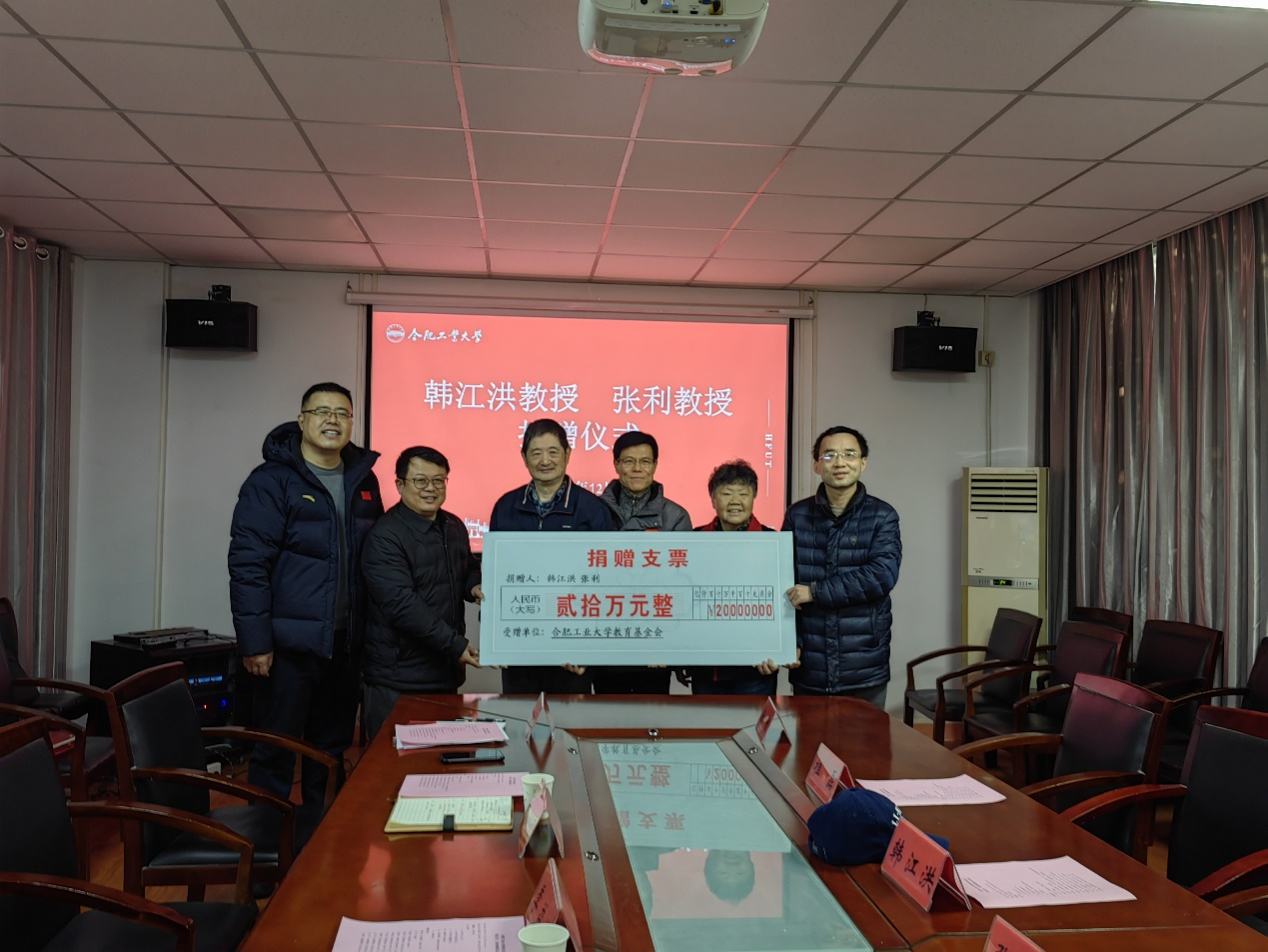 退休教授韩江洪老师与夫人机械学院退休教授张利老师为迎接建校八十周年,共同向学校教育基金会捐赠20万元人民币,以支持学校创新研究和实践的发展。