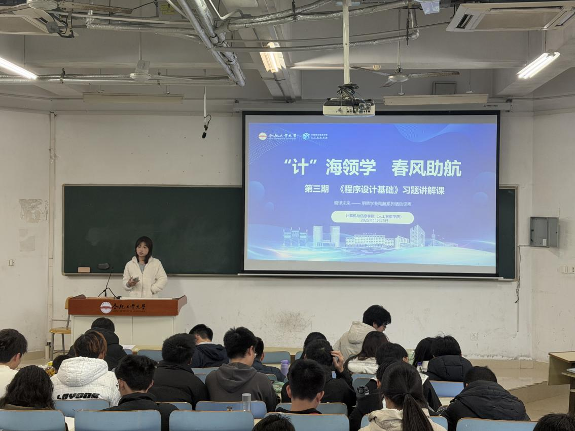 的“计”海领学,春风助航系列活动之一。作为衔接课堂教学与朋辈互助的实践载体,活动以精准聚焦的课程辅导替代泛化讲解,有效强化了大一新生对《程序设计基础》核心知识点的掌握,进一步激发了专业学习的热情与主动性。活动的顺利开展,为构建“高年级带低年级、优秀生帮潜力生”的学业互助氛围奠定了良好基础,也为持续推进学院新生适应性教育的精准化、常态化提供了有益经验。